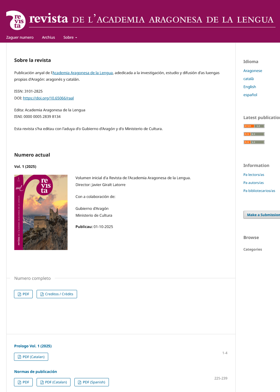 La Revista de l'Academia Aragonesa de la Lengua (RAAL) abre el plazo de recepción de originales para su Volumen 2, correspondiente al año 2026. Editada en Zaragoza por la Academia Aragonesa de la Lengua, la revista (ISSN-e: 3101-2825, ISSN: 3101-3864) constituye un espacio académico de referencia para la investigación en lingüística románica, sociolingüística y otras especialidades afines, con especial atención al aragonés, el catalán en Aragón y su contexto cultural.
